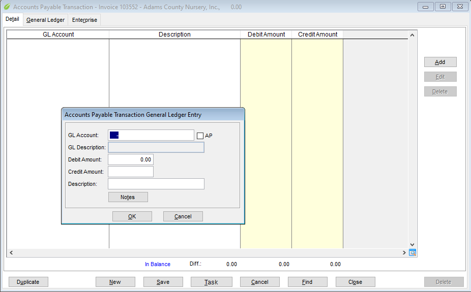 In cash method, the credit general ledger account will be the checking account specified in Activities>Accounts Payable>Pay Vendors. Therefore the credit g/l account will not be viewed on this tab. The Debit and Credit columns combined must match the invoice total. Most commonly there will be only entry in the debit column.