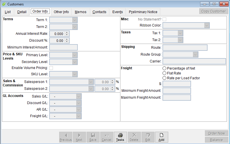 The default terms, salesman, discount amount, and freight amount information is defined on the Order Info tab of the Customer screen.