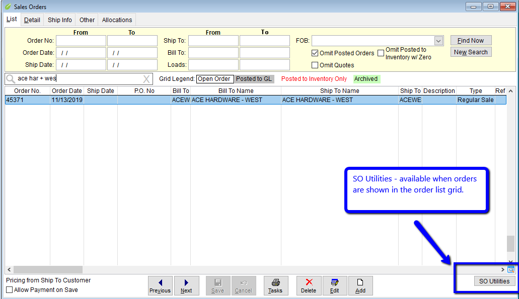 The Utilities grid will open with every order currently in the Sales Order List.