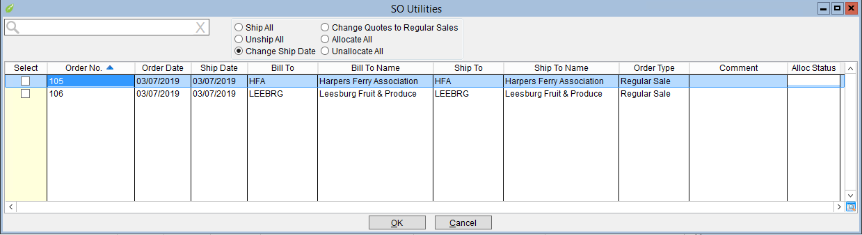 - Change Ship Date - Will change the ship date of every selected sales order to the same date entered by the user.