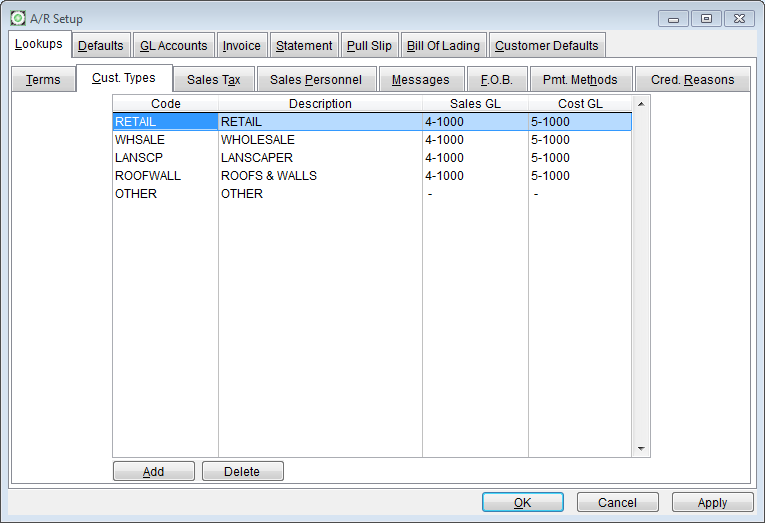 Code and Description are the minimum amount of information required to have a valid customer type. The code may be up to 10 characters long and the description 25. Sales and Cost GL accounts may be assigned to the Customer Type. These GL accounts will be used just before the Default GL accounts on the GL Accounts tab.