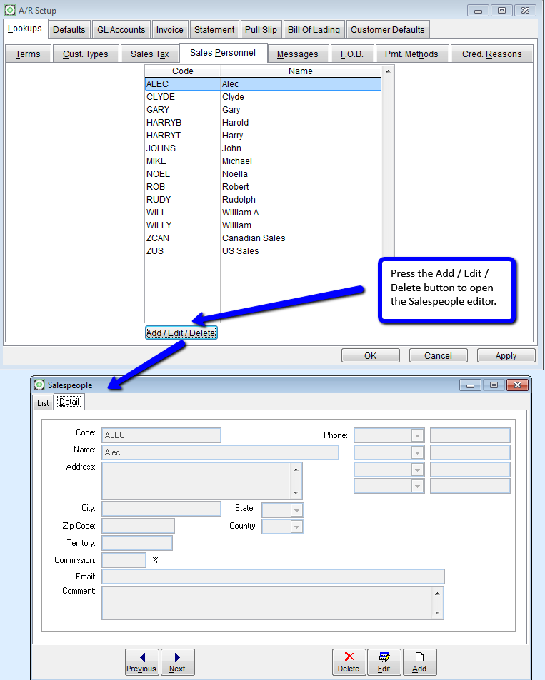 The Sales Personnel Tab shows a list of current salesperson records in the system. When the Add / Edit / Delete button is pressed a new window listing sales people appears.