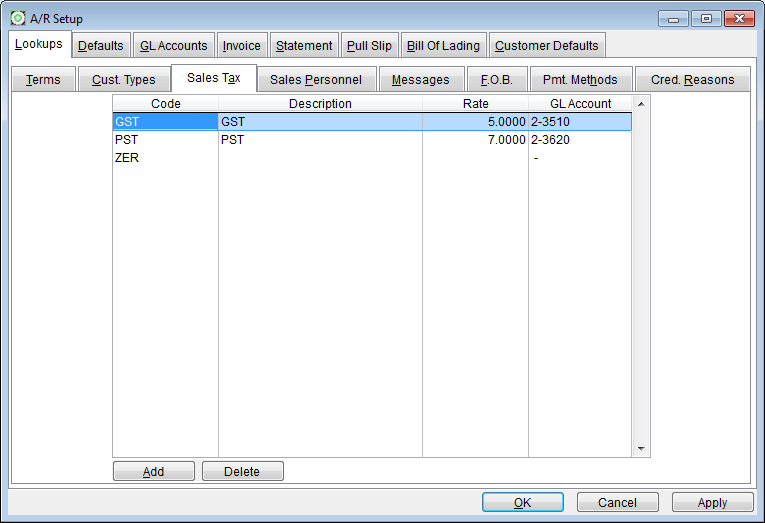 If the GL account is not added to the tax record, the system uses the default sales tax account defined in the Maintenance>Accounts Receivables>Setup.