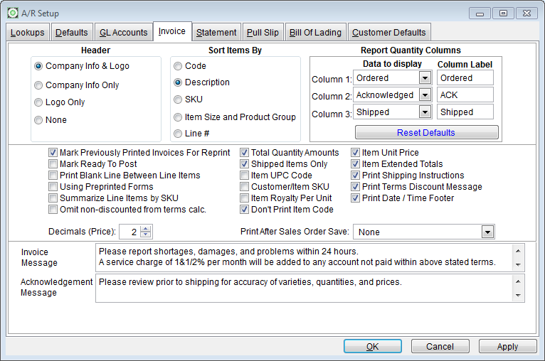 use this tab to define the default setting on how to print out your invoice/acknowledgements. You can change the options at anytime, and you may want to experiment with different ways to print them until finding the desired result. The following are options for use when printing: