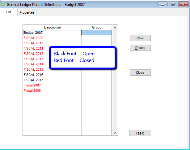 Both fiscal and budget periods are setup in this component. The period may be the usual 12 month year or a lesser number of months.