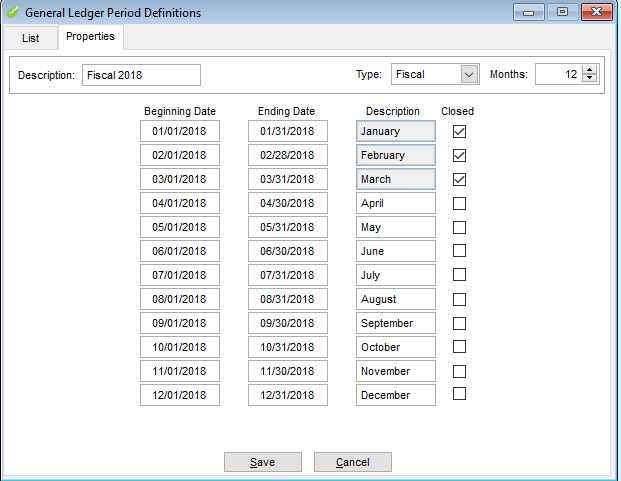 - The Closed column boxes may be used to temporarily close a month. Click on the box and check mark indicates the month is closed. This prevents any Dsys32 module from entering data in the checked as closed. A warning will appear if someone attempts to enter data with a closed monthly date. The boxes may be unchecked at any time, to allow entry.