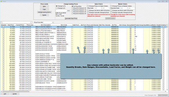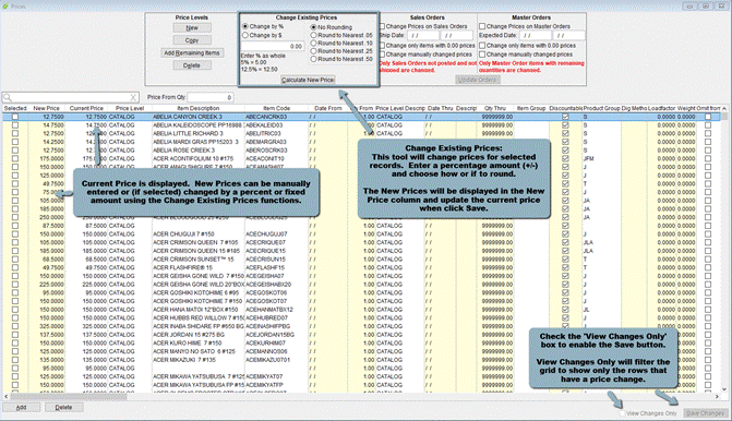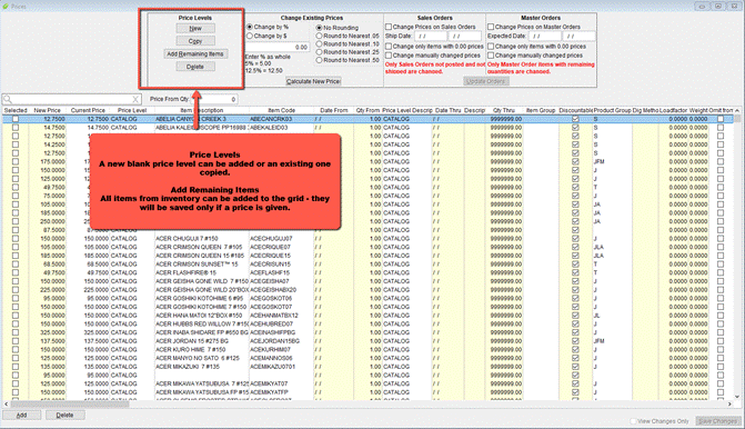 The form loads will every item price in every price level in a grid. The grid can be filtered and sorted in the same manner as all grids in GrowPoint.